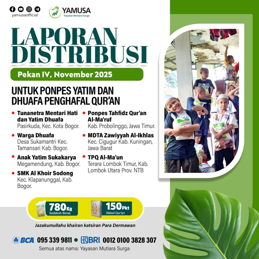 Alhamdulillah, pada pekan keempat bulan November 2025, program Yamusa kembali menyalurkan amanah para dermawan kepada para penerima manfaat di berbagai daerah. Setiap kilogram beras dan setiap mushaf Al-Qur’an yang disalurkan menjadi wujud kepedulian bersama untuk menghadirkan kebaikan yang lebih luas. Distribusi dimulai dengan penyaluran 150 kg beras kepada Dhuafa Disabilitas Tunanetra Mentari Hati serta anak […]