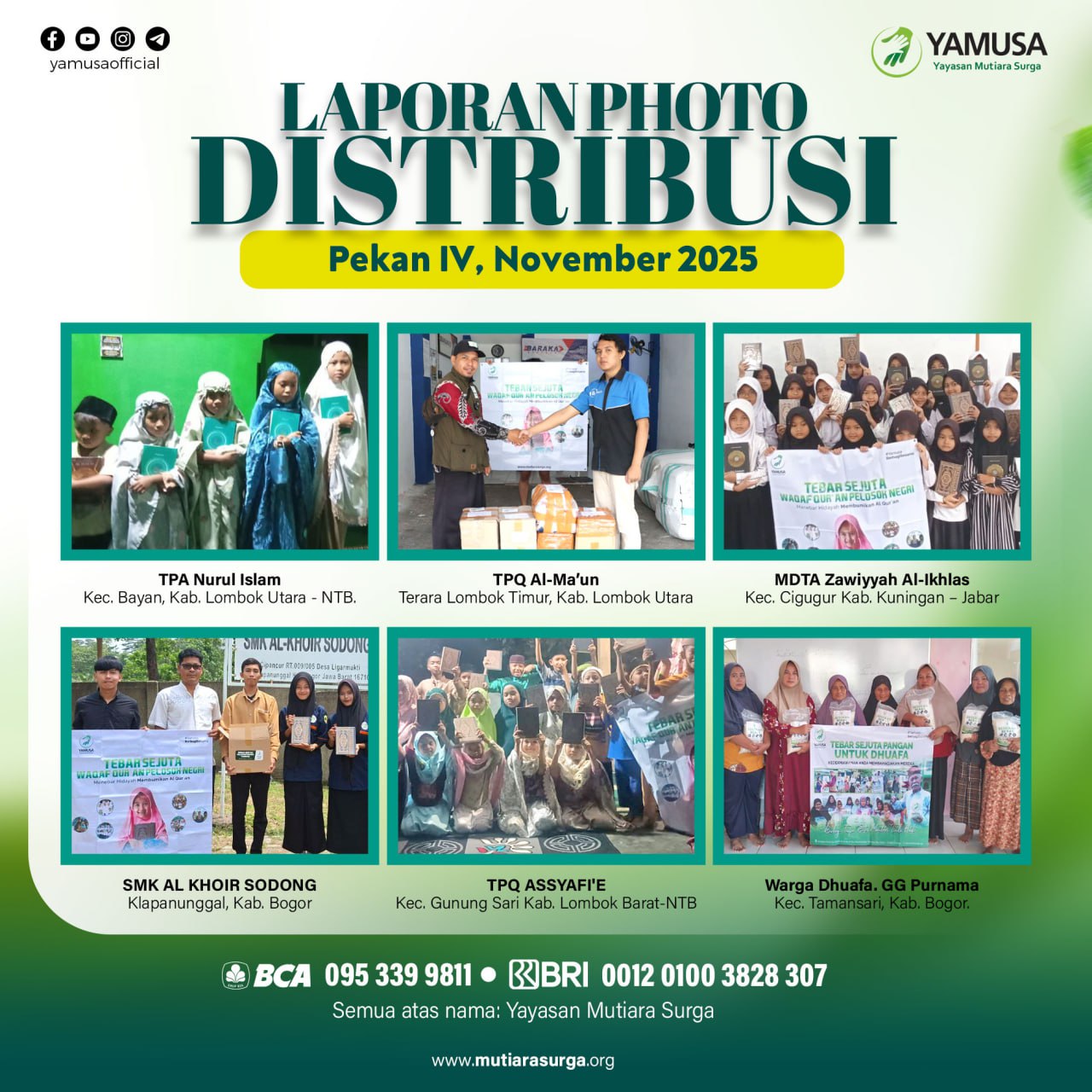 Alhamdulillah, pada pekan keempat bulan November 2025, program Yamusa kembali menyalurkan amanah para dermawan kepada para penerima manfaat di berbagai daerah. Setiap kilogram beras dan setiap mushaf Al-Qur’an yang disalurkan menjadi wujud kepedulian bersama untuk menghadirkan kebaikan yang lebih luas.
