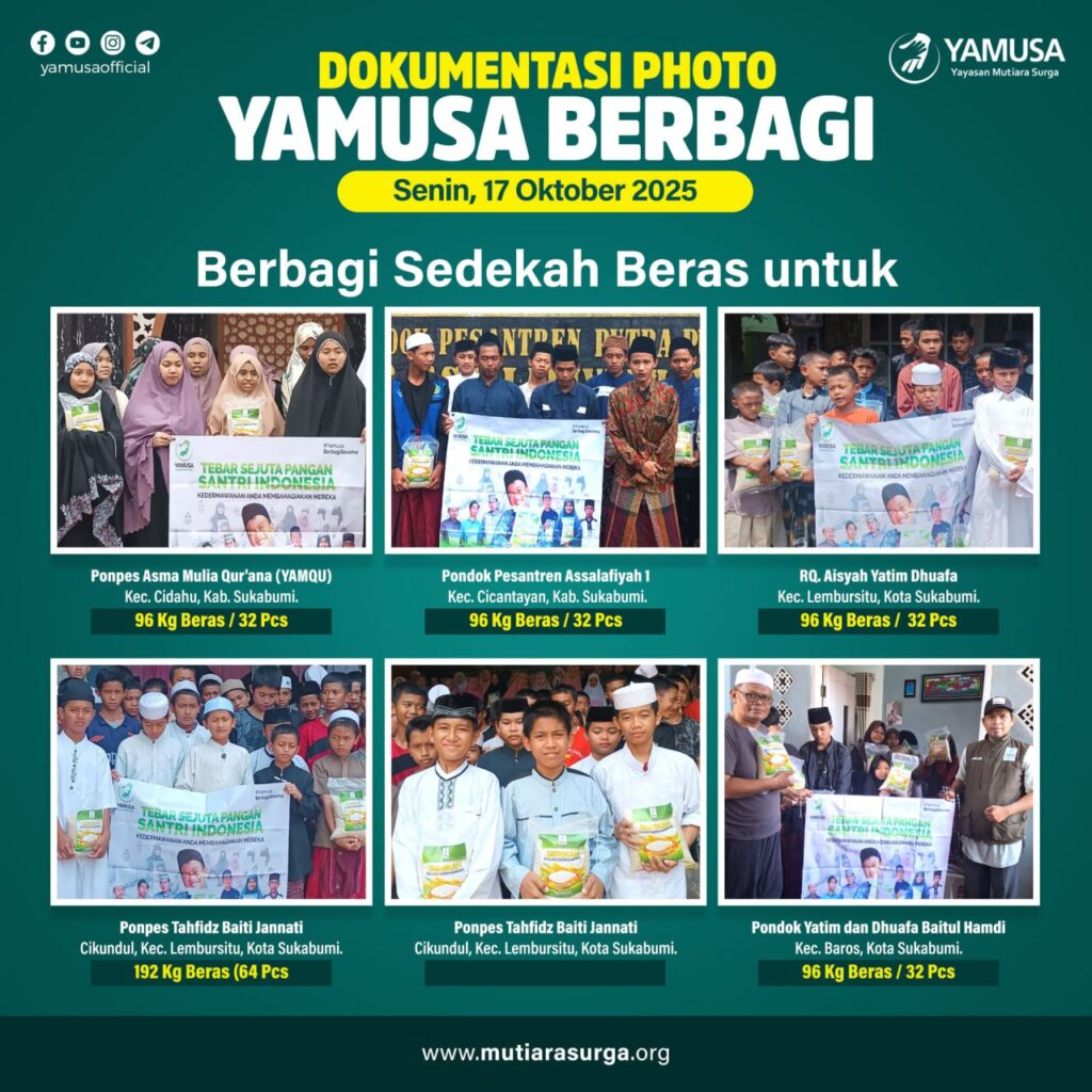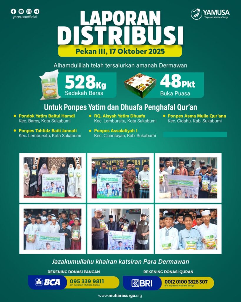 Alhamdulillah, memasuki pekan ketiga bulan Oktober 2025, langkah-langkah kecil penuh kepedulian dari para dermawan kembali membawa keberkahan. Melalui program kebaikan yang dijalankan oleh Yamusa, telah tersalurkan 528 kilogram beras dan 48 paket buka puasa sunnah bagi para santri serta penerima manfaat di sejumlah pondok dan lembaga yang menaungi yatim, dhuafa, dan para penghafal Al-Qur’an.