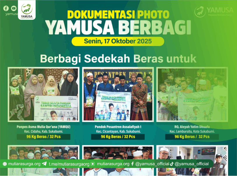 Pada tanggal 17 Oktober 2025, tim Yamusa kembali turun langsung ke lapangan menyalurkan amanah ini ke lima titik lokasi di wilayah Sukabumi dan sekitarnya.