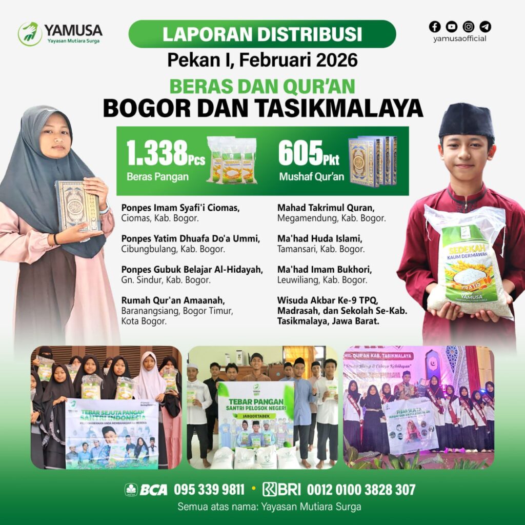 Alhamdullilah, berikut laporan distribusi program Yamusa di pekan pertama bulan Februari 2026 dengan total bantuan 1.338 Kg beras dan 605 Mushaf Al Quran :