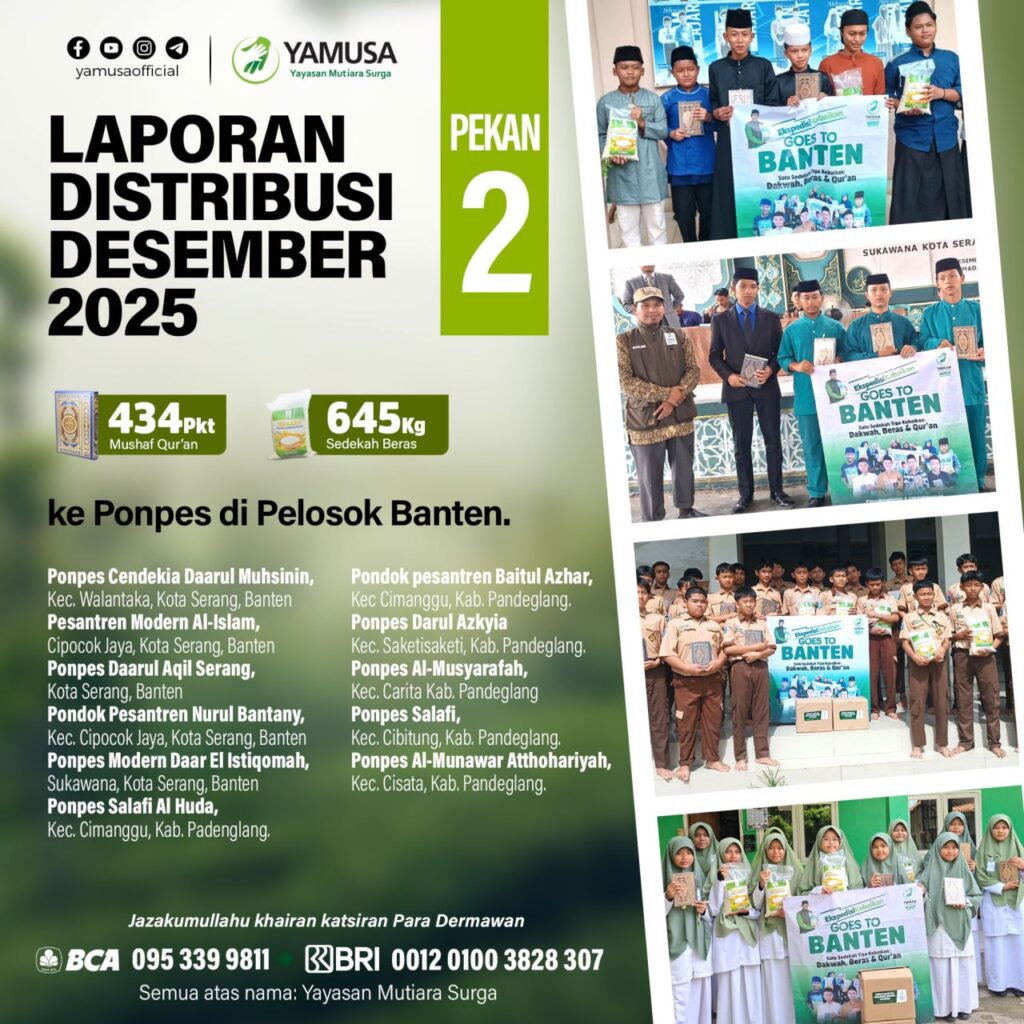 Alhamdullilah, berikut laporan distribusi program Yamusa di pekan kedua bulan Desember 2025 dengan total bantuan 645 Kg beras dan 434 Mushaf Al Qur`an :
