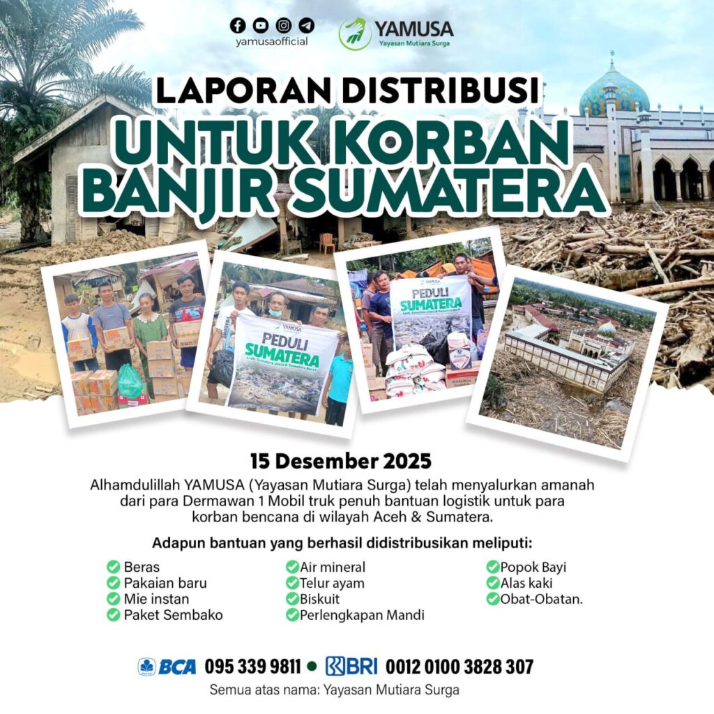 Alhamdulillah, pada Senin, 15 Desember 2025, YAMUSA telah menyalurkan bantuan logistik untuk saudara-saudara kita yang terdampak banjir bandang di Aceh dan Sumatera. Bantuan berupa :